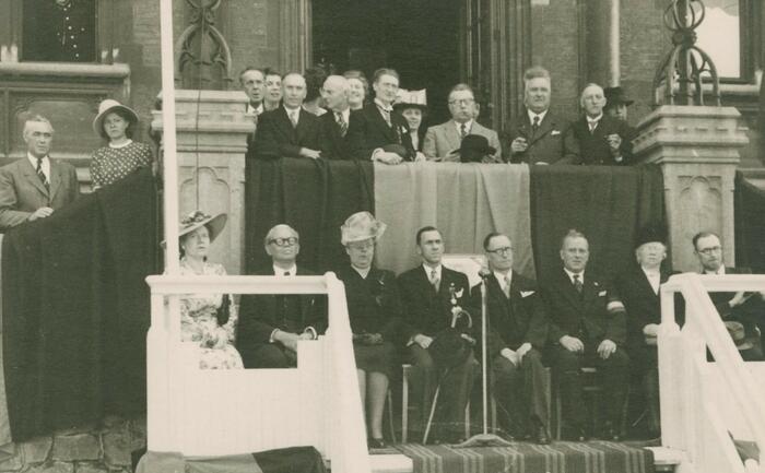 Reception for Marcel Louette in 1946. Louette is seated in the front row, fourth from the left. (© Antwerp City Archives)